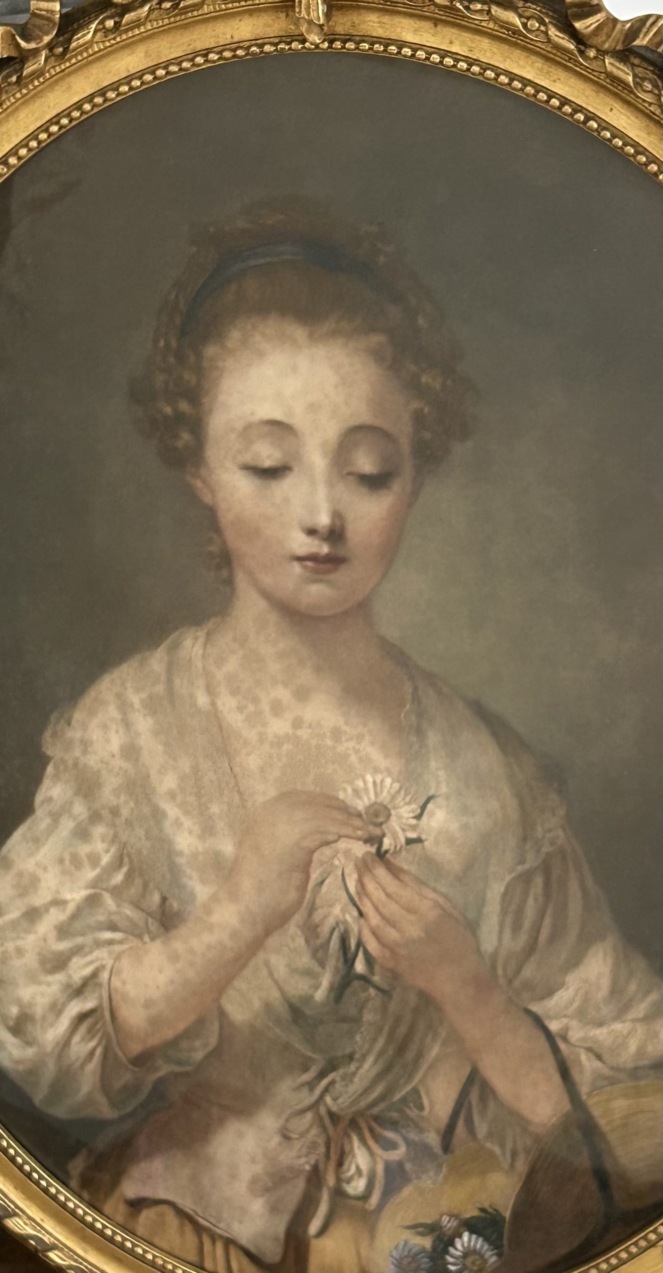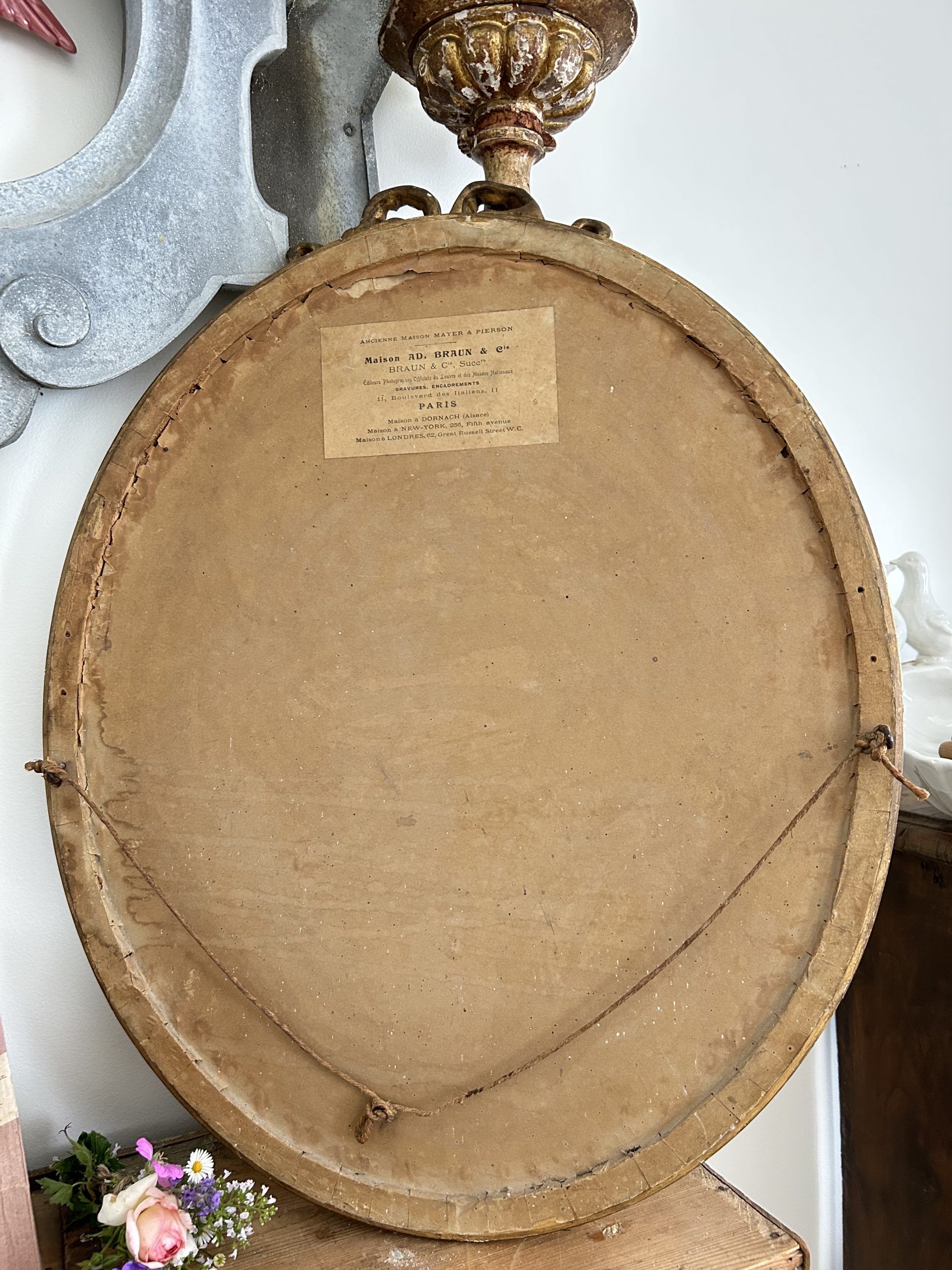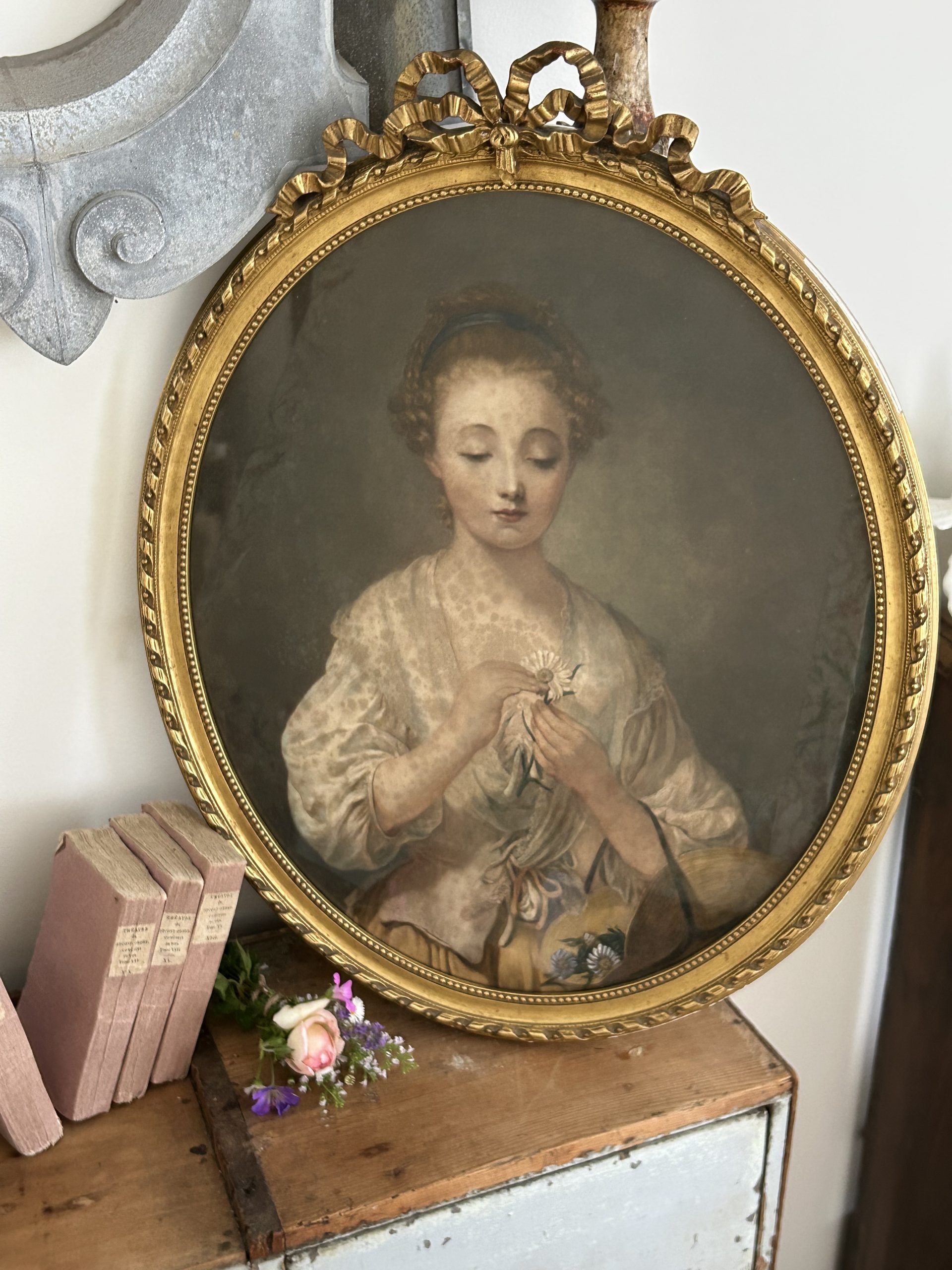merveilleuse gravure, mise en valeur par un très beau cadre en bois doré de forme ovale et de style Louis XVI.