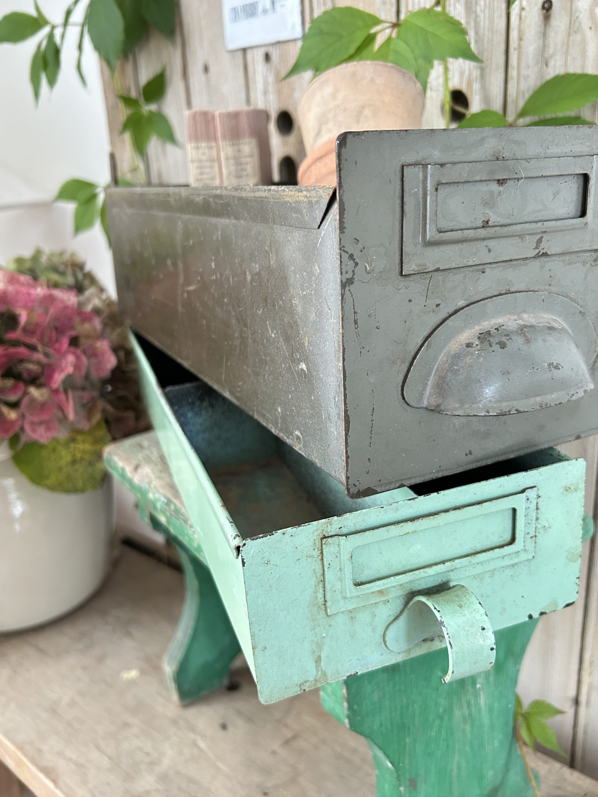 duo de 2 anciens tiroirs d’atelier en métal,