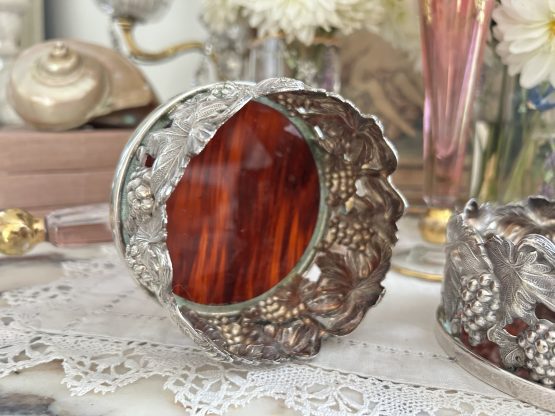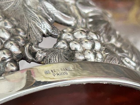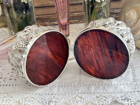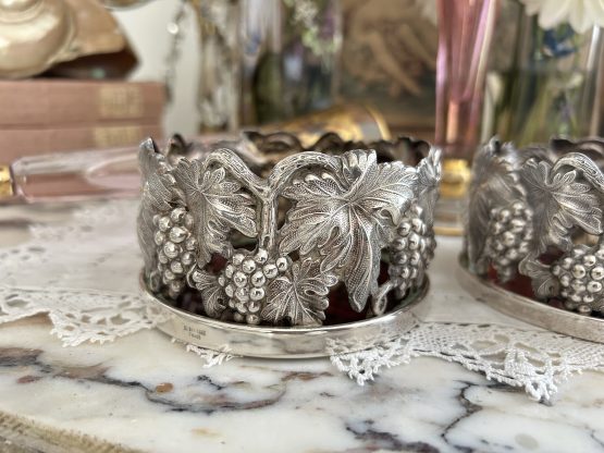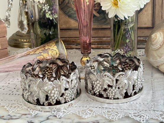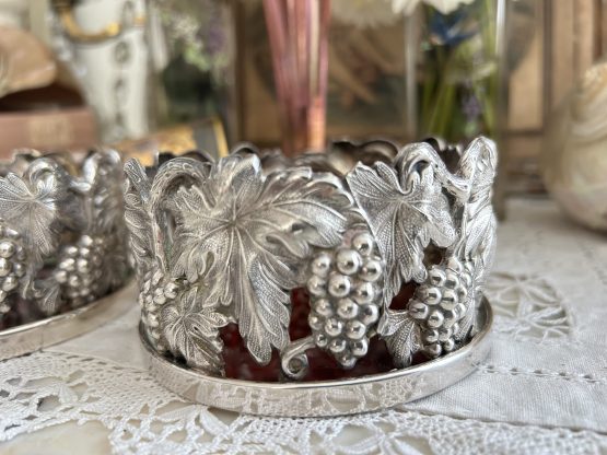 Paire de cache bouteille en métal argenté ciselé de grappes de raisins.